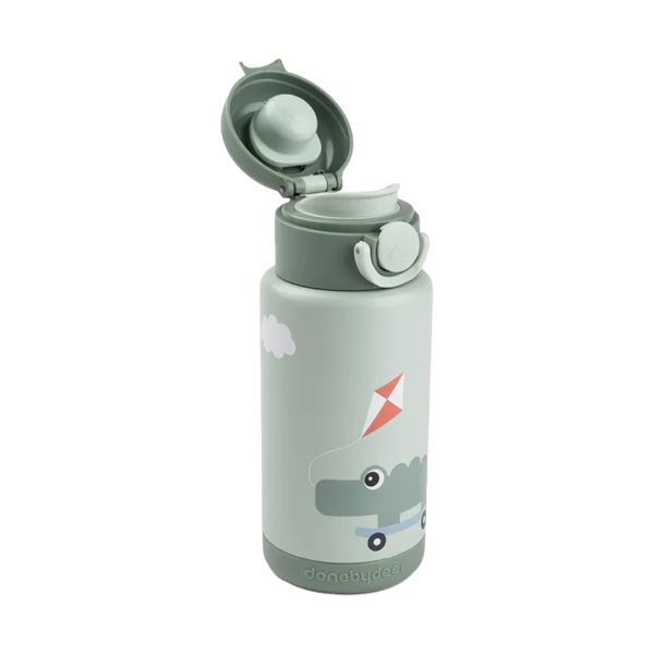 De Done by Deer Thermo Fles - Playground - Groen - 340 ml is perfect voor onderweg. Dankzij het dubbelwandige roestvrijstaal blijft de inhoud tot wel 6 uur warm of koud, ideaal voor warme chocolademelk in de winter of een verfrissend drankje in de zomer. Het vrolijke Croco & Birdee design maakt deze fles extra leuk voor kinderen en zorgt ervoor dat drinken op school, opvang of tijdens dagjes uit nog leuker wordt. De fles is voorzien van een handige drukknop, waardoor je kindje deze gemakkelijk zelf kan openen. De siliconen ring zorgt voor een luchtdichte, lekvrije afsluiting, zodat je hem zorgeloos in de tas kunt meenemen. Dankzij het stevige draaghandvat is de fles eenvoudig mee te nemen of aan een tas te bevestigen. Het BPA-vrije materiaal maakt het drinken veilig en gezond voor je kindje. Bovendien is de fles compact en licht van gewicht, waardoor hij goed in kleine kinderhandjes past. Een duurzame en praktische keuze voor elke dag!