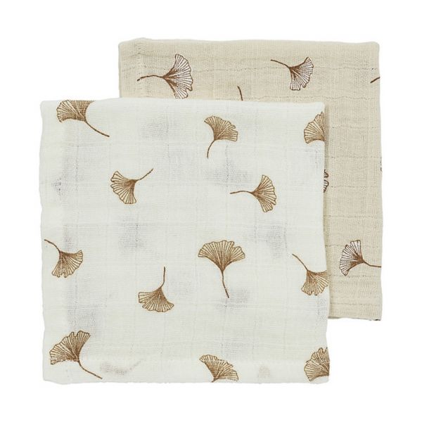 De doekjes hebben een schattige Gingko-print in rustige aardetinten en komen in twee kleuren: offwhite en soft sand. Dankzij het compacte formaat zijn ze ideaal als spuugdoekje, poetsdoekje of zelfs als washandje. Door het ademende en absorberende materiaal blijven ze fris en drogen ze snel na gebruik.